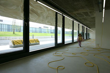 Aber auch der Innenraum leidet an Eigensinn: Durch den im Fußraum der Fensterfront freigegebenen Blick offenbart sich nur der Teil des Raumes, der süffisant mit sich selber spielt: der Boden ist bedeckt mit stromführenden Kabeln in lichtem Gelb, die in ebenso barocken Windungen ein Spiel der Energie mit sich selbst inszenieren: Die gelben Stromführer versorgen die tiefer gelegte Raumbeleuchtung mit dem, was sie selbst beleuchtet. Wo die Energie dazu kommt, sich selbst zu beschauen verwirklicht sich ein innerer Kreislauf mit ambivalenter Kurzschlussqualität. Der isolierte Raum konnotiert sich als offene Form im flüssigen Gleiten der Kurven und Amplituden, aber auch als totes Gleis, dead end oder closed circuit im ewig wiederholten spiel mit sich selbst, das nur dann aufgebrochen wird, wenn jemand den Raum betritt...